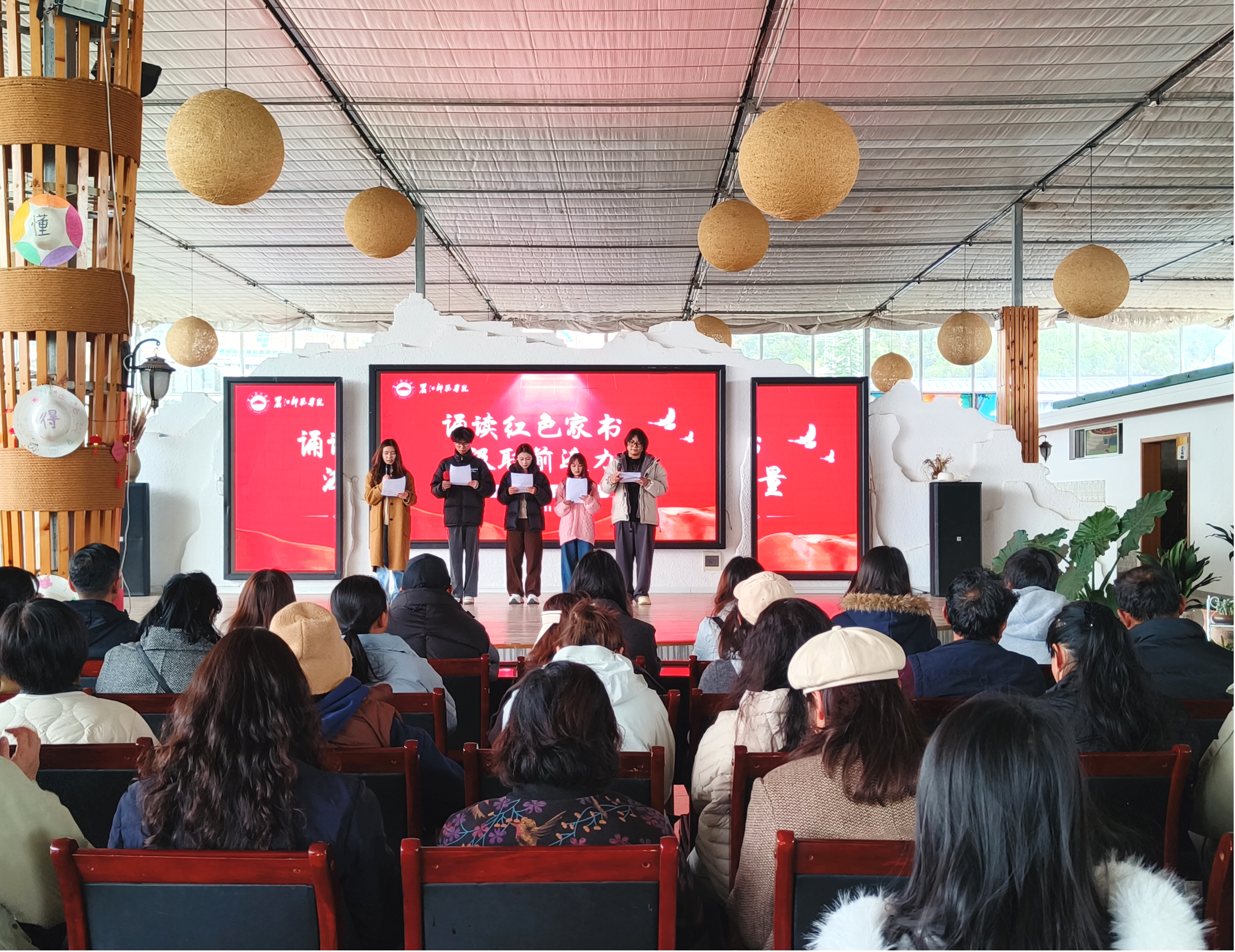 在“诵读红色家书,汲取前进力量”专题环节中,学生代表依次深情诵读了老一辈革命家和先进模范人物的红色家书,这些珍贵的家书中承载的家国情怀、坚定信仰与赤子之心,让在场师生深受教育和启迪。大家围绕家书中的历史背景、精神内涵展开深入交流,从红色家书中汲取不忘初心、砥砺前行的精神养分,进一步筑牢理想信念根基,强化使命担当意识。