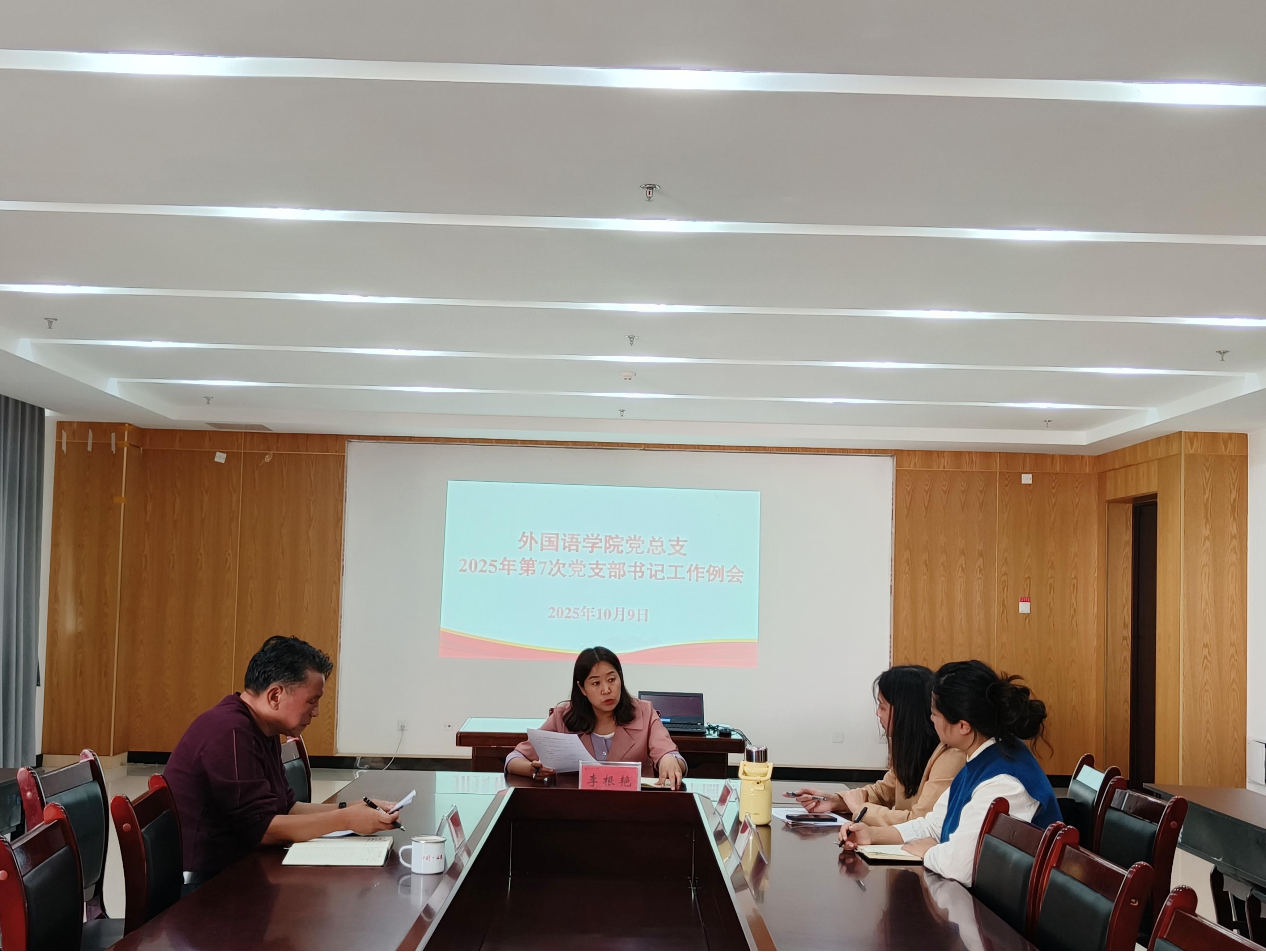 10月9日下午,外国语学院党总支在励志楼401会议室召开2025年第7次党支部书记工作例会。会议由学院党总支书记李根艳主持会议,党总支副书记、专职组织员、教师党支部书记及学生党支部书记参加。